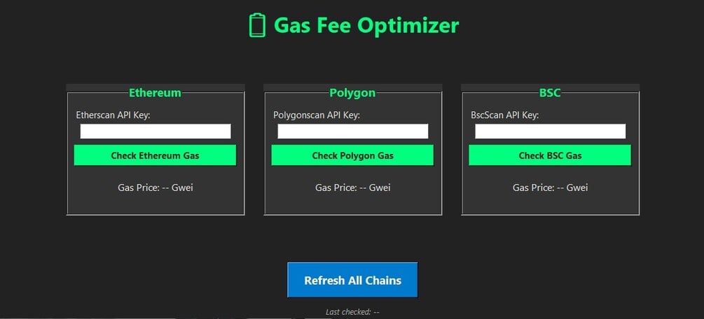- Click “Check Gas” or “Refresh All” to see current gas prices and fee categories.